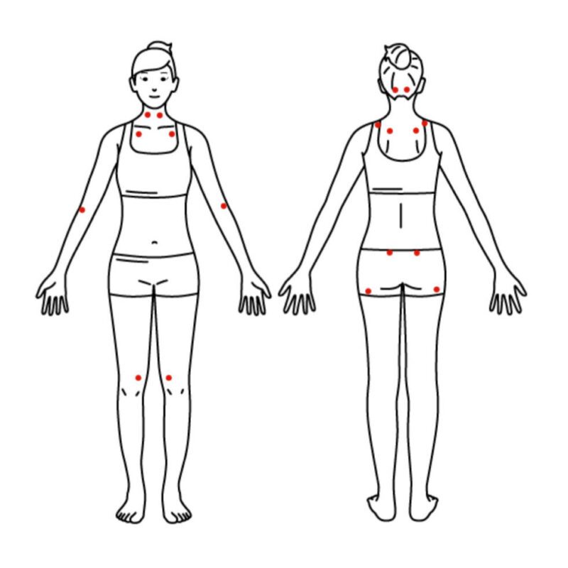 線維筋痛症確立された18か所の圧痛点のうちに約4 kgの力 (親指の爪床が白くなるくらいの圧力)で指で押圧すると、11か所以上に圧痛が見られれば陽性。